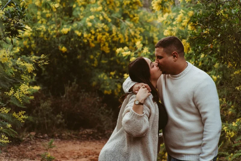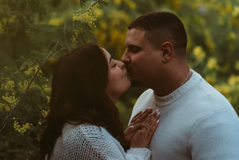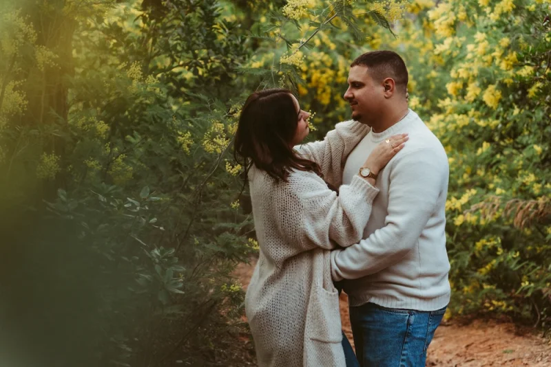 Pour cette séance photo couple à Mouans-Sartoux, nous avons choisi la forêt pour son côté sauvage et authentique. Les mimosas illuminaient le décor de leurs touches jaunes éclatantes, contrastant avec le ciel gris et la douceur de la pluie.