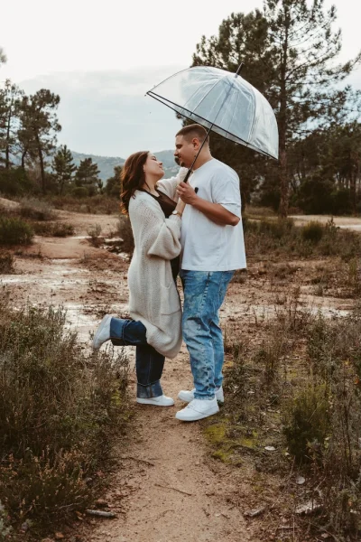 J’aime ces conditions imprévues : elles créent du mouvement, de la vie, des instants vrais. La pluie apporte une dimension poétique, presque intemporelle, parfaite pour une séance engagement en extérieur dans les Alpes-Maritimes.